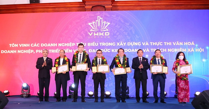Bộ trưởng Nguyễn Văn Hùng, Chủ tịch Hiệp hội Văn hóa doanh nghiệp Việt Nam Hồ Anh Tuấn trao chứng nhận các doanh nghiệp đạt chuẩn văn hoá kinh doanh Việt Nam