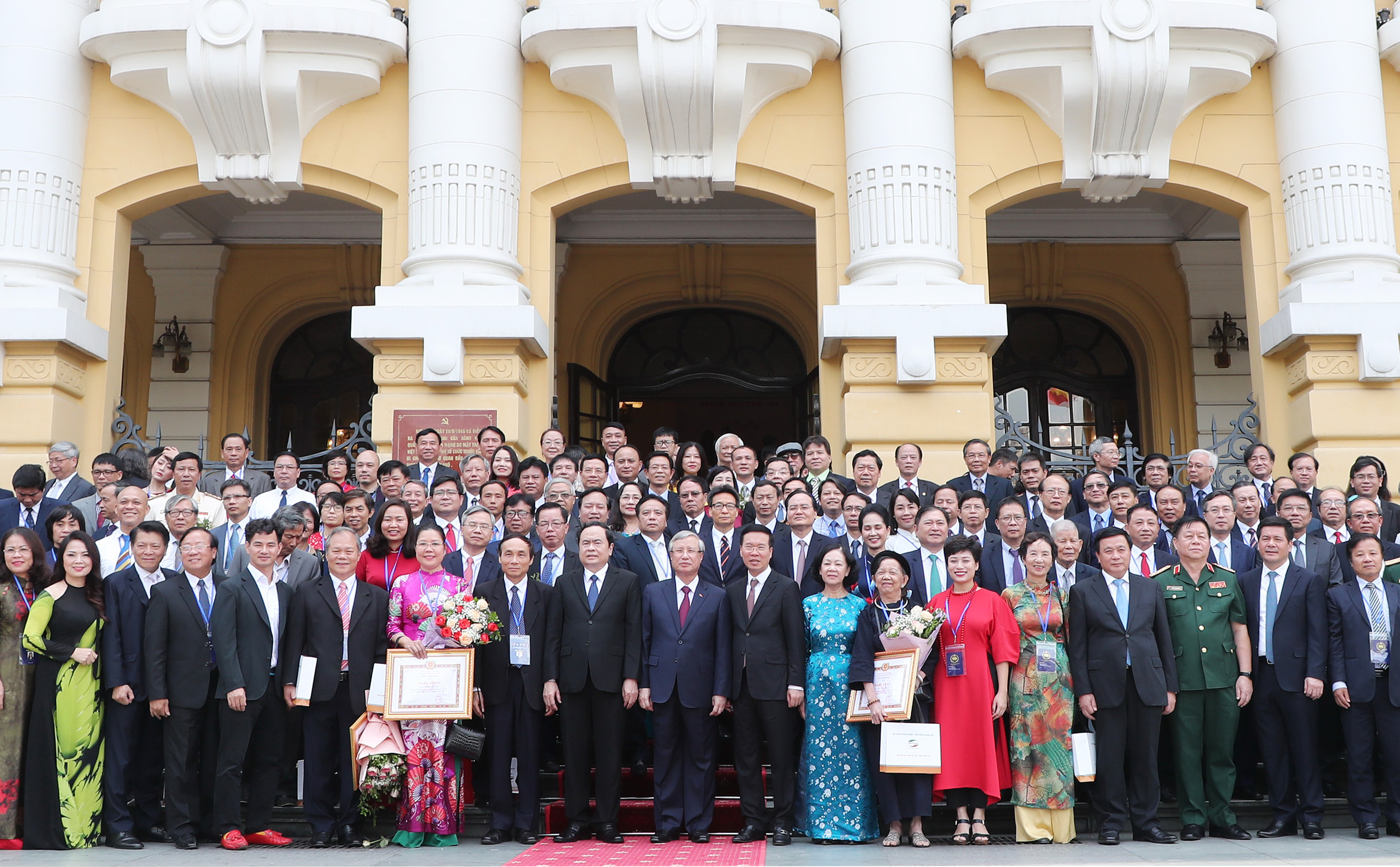 Các đồng chí lãnh đạo Đảng, Nhà nước chụp ảnh chung với các đại biểu dự Hội nghị