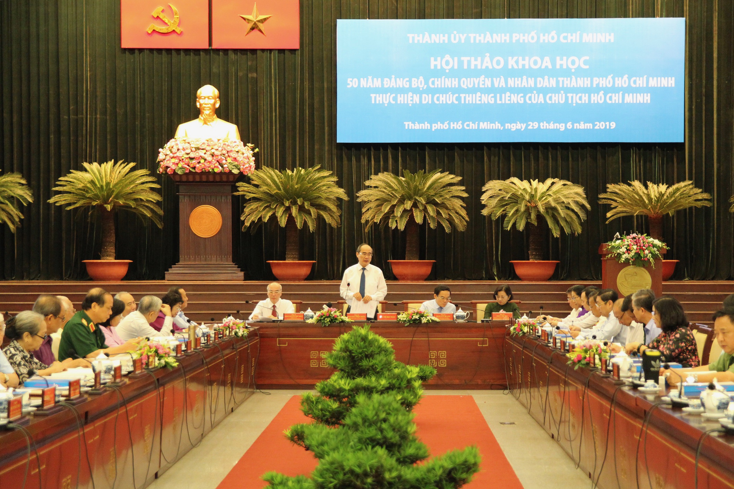 Chủ trì hội thảo, Ủy viên Bộ Chính trị, Bí thư Thành ủy TP.HCM Nguyễn Thiện Nhân nhấn mạnh, thực hiện Di chúc của Người, TP.HCM đã đạt được những thành tựu to lớn, có ý nghĩa lịch sử. Vị trí, vai trò đầu tàu về kinh tế - xã hội của thành phố đối với khu vực và cả nước tiếp tục được phát huy… Soi lại với những điều Bác Hồ hằng mong thì TP.HCM vẫn còn những hạn chế như kinh tế phát triển chưa tương xứng với tiềm năng và lợi thế, phát triển văn hóa chưa tương xứng với vai trò, vị trí là đô thị đặc biệt của cả nước. Do đó, Đảng bộ TP.HCM phải tiếp tục đẩy mạnh việc học tập, thấm nhuần hơn Di chúc của Bác Hồ kính yêu, để theo kịp với yêu cầu nhiệm vụ trong giai đoạn mới. Bí thư Nguyễn Thiện Nhân cũng mong muốn các nhà khoa học tiếp tục nghiên cứu sâu hơn nội dung của Di chúc Bác Hồ, đặc biệt là giá trị văn hóa của Di chúc.