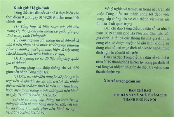 Được biết, để cuộc Tổng điều tra thành công tốt đẹp, Ban Chỉ đạo Tổng điều tra dân số nhà ở thành phố Hà Nội đã có thư gửi tới từng hộ gia đình về Tổng điều tra dân số và nhà ở năm 2019.