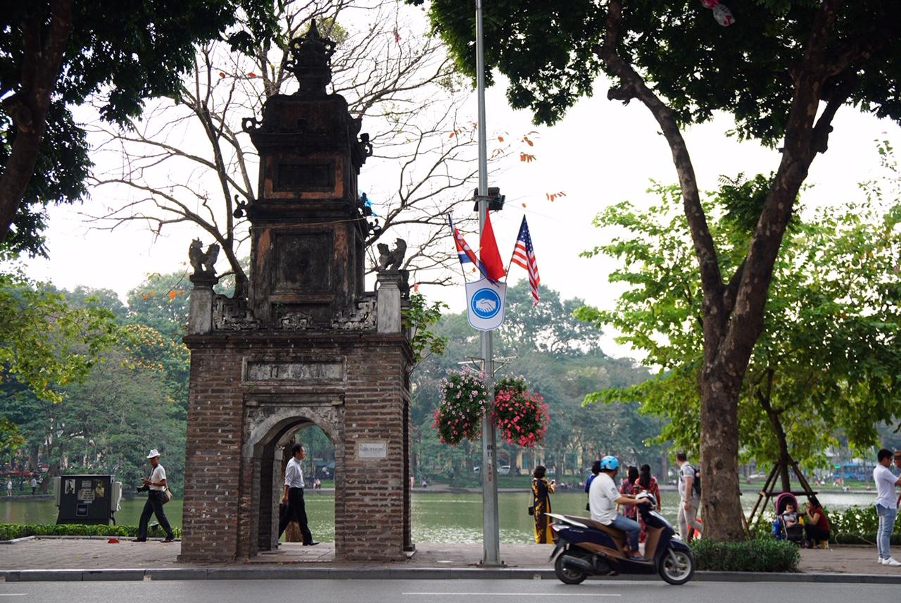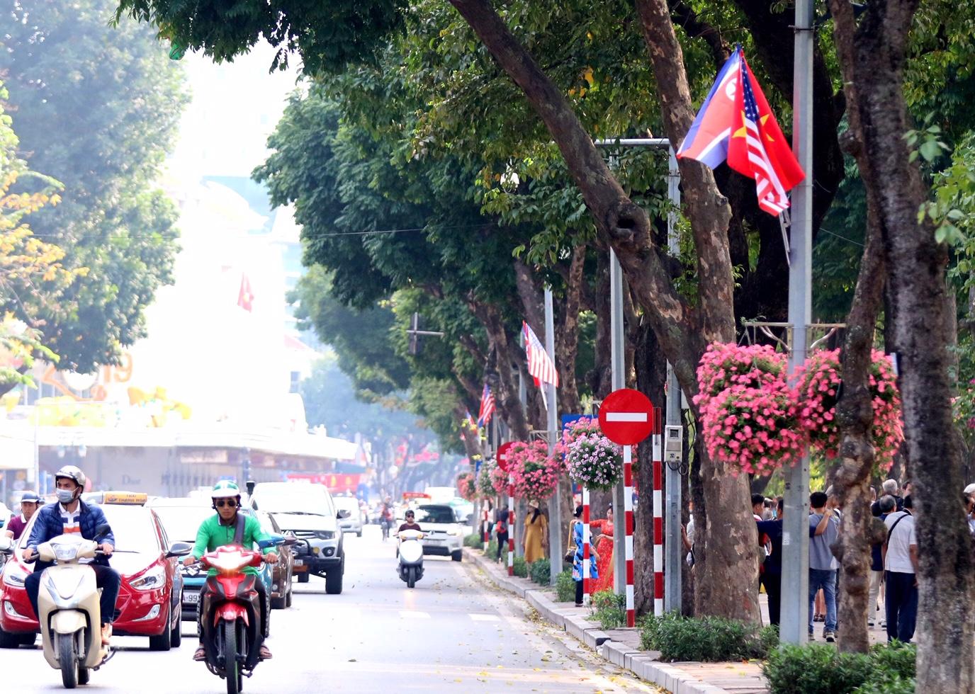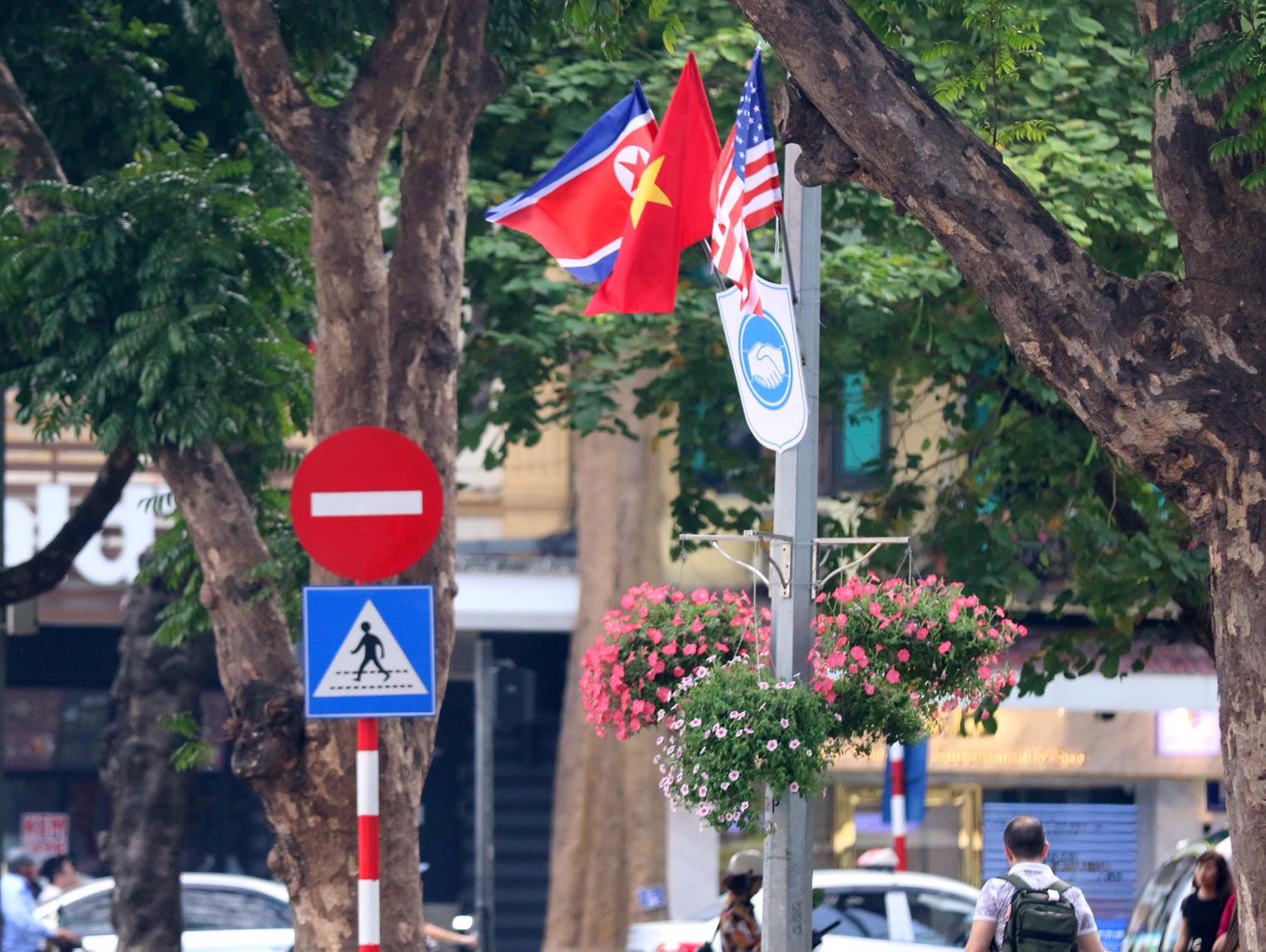 Nhiều tuyến phố được trang hoàng rực rỡ với quốc kỳ Triều Tiên, Hoa Kỳ và quốc kỳ Việt Nam cùng những giò hoa tươi.