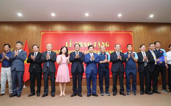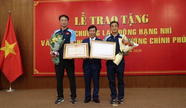 Bộ trưởng Nguyễn Ngọc Thiện trao Huân chương Lao động hạng Nhì cho HLV Park Hang-seo và Bằng khen của Thủ tướng cho 2 trợ lý HLV