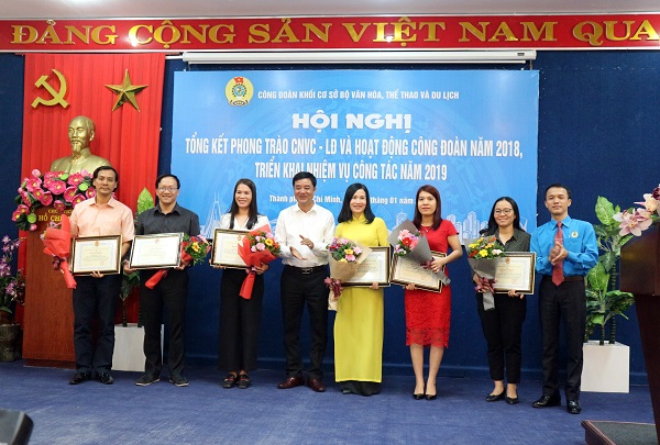 Nhằm ghi nhận những thành tích xuất sắc của các tập thể và cá nhân trong hoạt động Công đoàn, Ban Thường vụ Liên đoàn Lao động TP.HCM đã trao Cờ thi đua xuất sắc cho 3 tập thể; trao Bằng khen cho 6 tập thể và 3 cá nhân. Bên cạnh đó, Ban Thường vụ Công đoàn Khối cơ sở Bộ VHTTDL đã tặng giấy khen cho 41 tập thể có thành tích xuất sắc trong phong trào công nhân, viên chức, lao động và xây dựng tổ chức Công đoàn vững mạnh; tặng giấy khen cho 54 cá nhân đạt danh hiệu Công đoàn viên xuất sắc tiêu biểu năm 2018; tặng giấy khen cho 7 cá nhân đã có nhiều thành tích đóng góp cho hoạt động Công đoàn năm 2018.