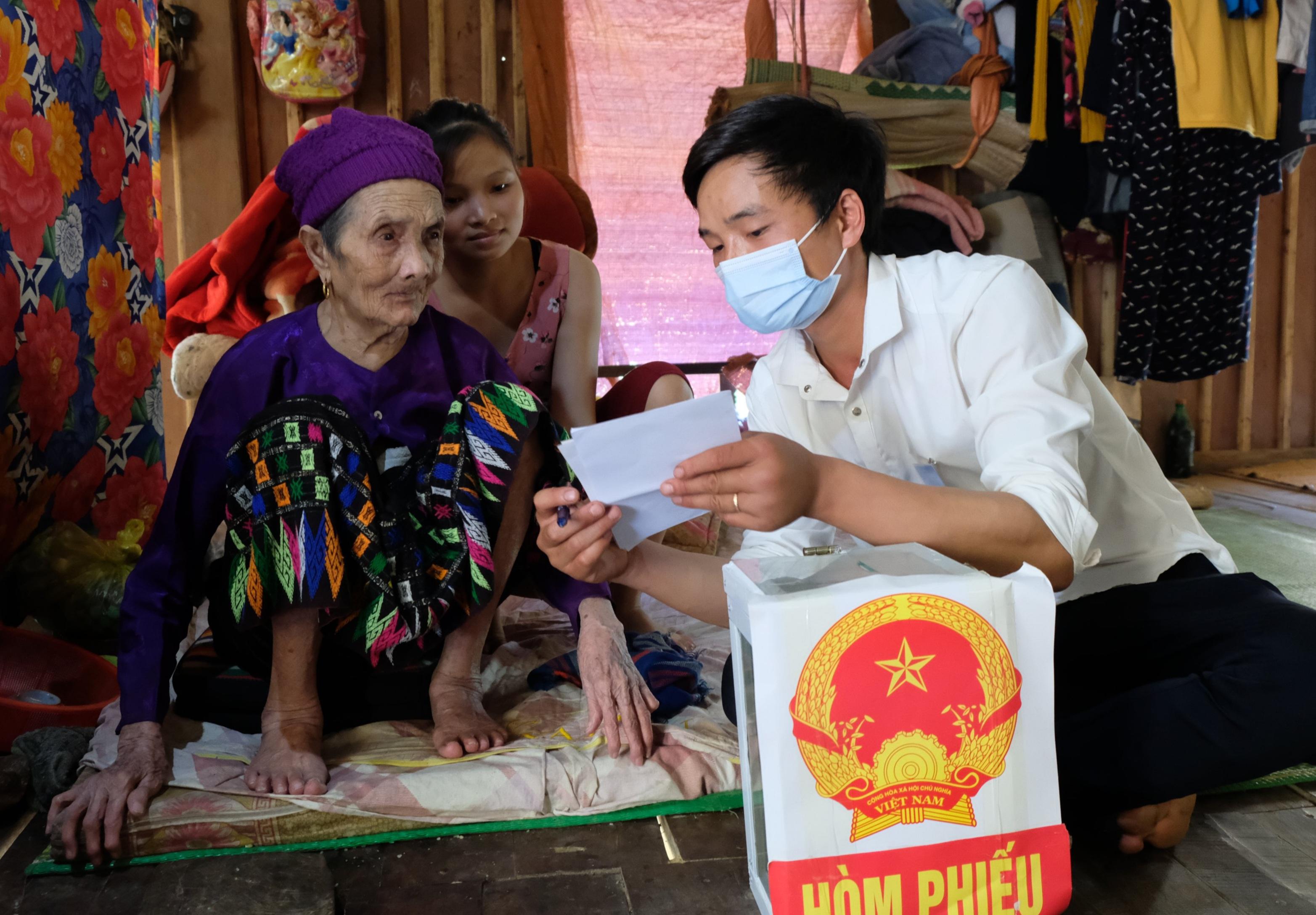 Cụ Vi Thị Ông (100 tuổi, người dân tộc Thái, bản Vịn, xã Bát Mọt, huyện Thường Xuân, Thanh Hóa) xúc động khi cán bộ mang thùng phiếu tới nhà