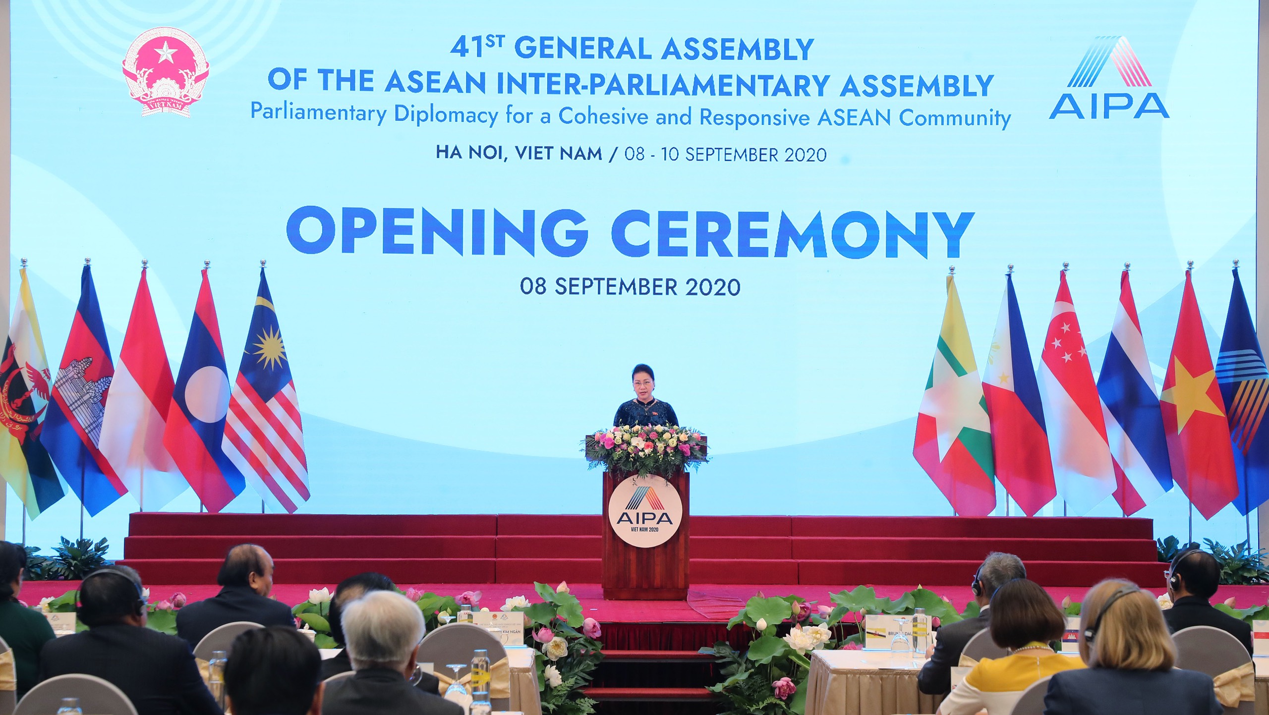 Phát biểu tại Lễ khai mạc, Chủ tịch Quốc hội Nguyễn Thị Kim Ngân, Chủ tịch AIPA 41 khẳng định: “Lần đầu tiên trong lịch sử 43 năm của AIPA, Đại hội đồng AIPA được tổ chức bằng hình thức trực tuyến. Trong lúc đại dịch Covid-19 vẫn đang diễn biến phức tạp, tác động nghiêm trọng tới các hoạt động chính trị, kinh tế, xã hội của mọi quốc gia trên toàn thế giới, việc chúng ta tổ chức Đại hội đồng AIPA 41 thể hiện sự quyết tâm và nỗ lực của các nghị viện đồng hành cùng Chính phủ các nước ASEAN vượt qua khó khăn, đẩy lùi dịch bệnh, tiến lên phía trước vì ấm no, hạnh phúc cho mỗi người dân, vì sự hợp tác và sự phát triển của Cộng đồng ASEAN”.
