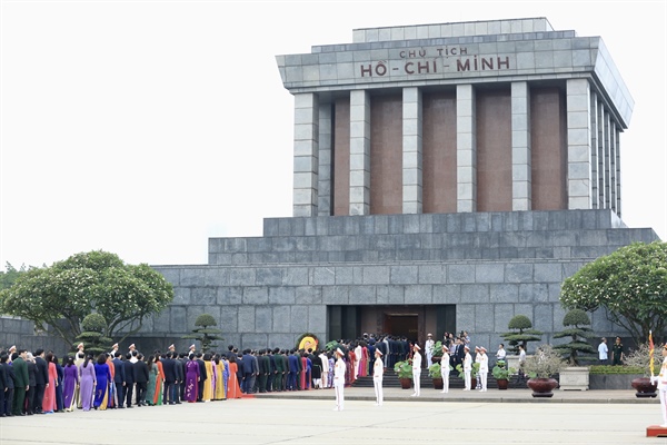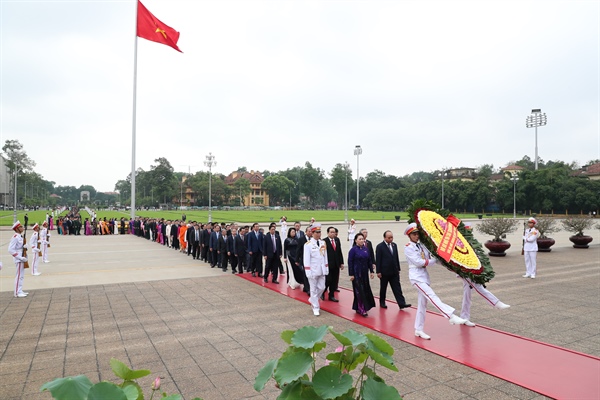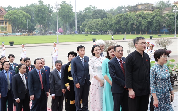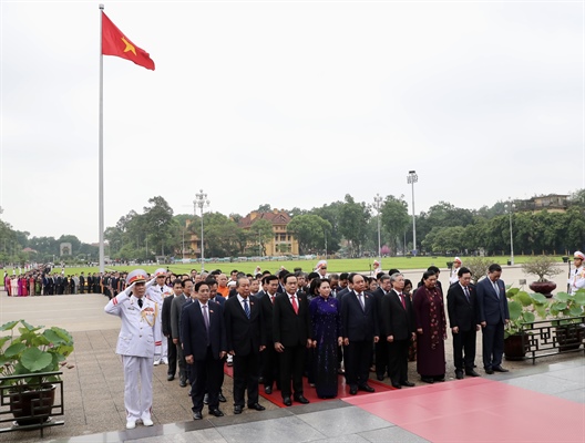 Trước đó, 7h15 sáng cùng ngày, Đoàn đại biểu gồm các vị Lãnh đạo Đảng, Nhà nước, Mặt trận Tổ quốc Việt Nam và các đại biểu Quốc hội xuất phát từ Tòa nhà Quốc hội đã tới đặt vòng hoa và vào Lăng viếng Chủ tịch Hồ Chí Minh.