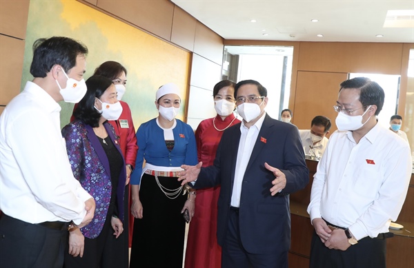 Thủ tướng Chính phủ Phạm Minh Chính trao đổi, thảo luận cùng các đại biểu bên hành lang Quốc hội