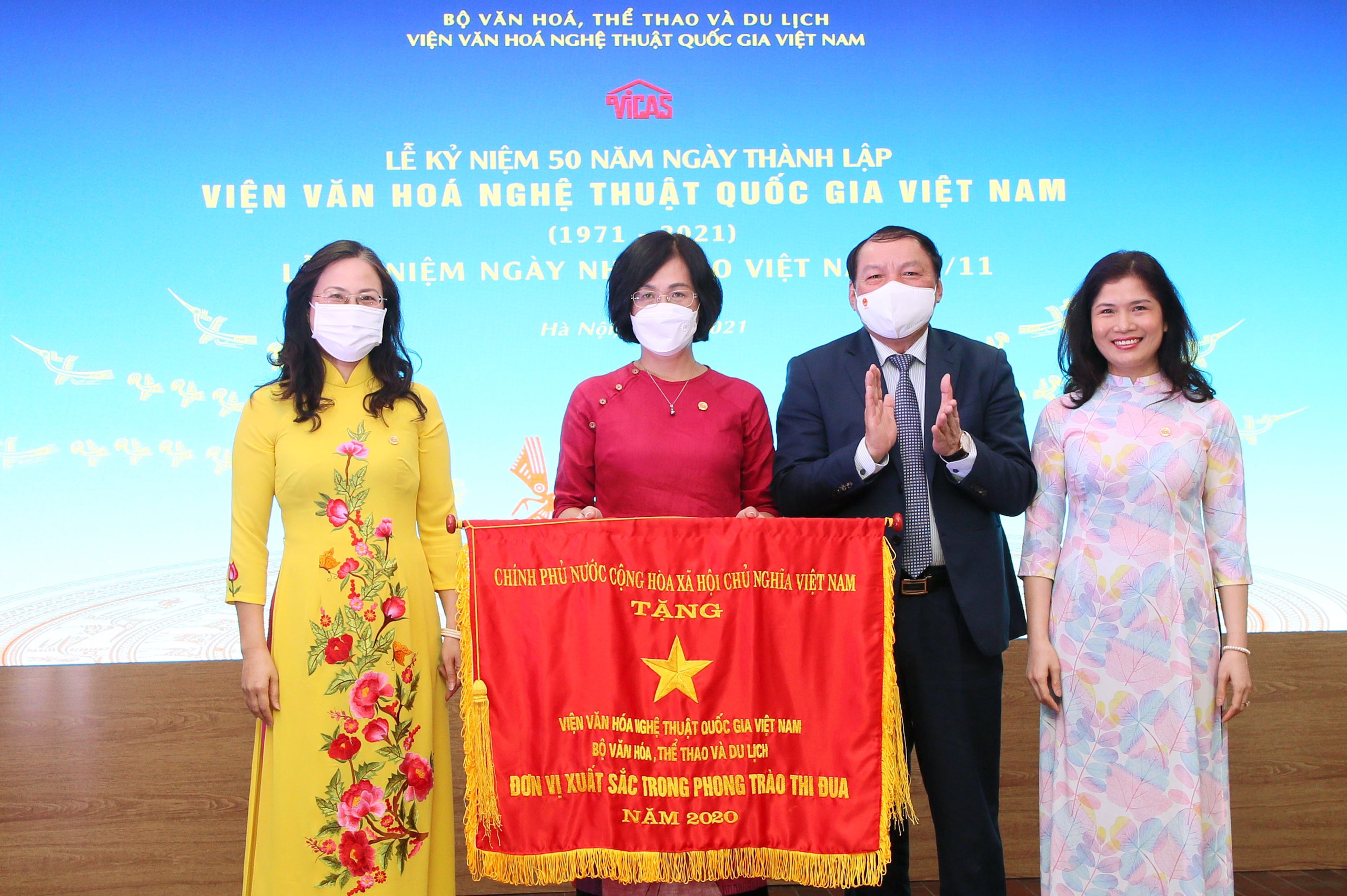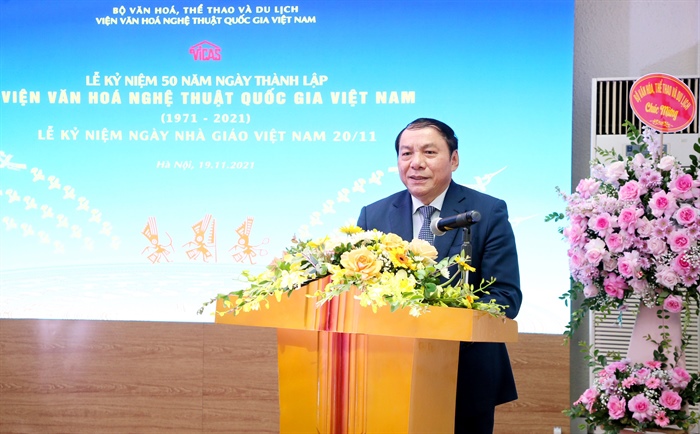 Chúc mừng những thành tựu của Viện VHNT quốc gia Việt Nam trong 50 năm qua, Bộ trưởng Nguyễn Văn Hùng chia sẻ, đất nước ta đang đối mặt với nhiều khó khăn, thách thức do tác động của đại dịch Covid-19. Đảng, Chính phủ, Quốc hội đã có nhiều quyết sách để tập trung ứng phó với dịch bệnh, thực hiện chủ trương thích ứng an toàn một cách có hiệu quả để đưa đất nước về trạng thái bình thường mới. Trong bối cảnh đó, ngành VHTTDL đã nỗ lực để triển khai thực hiện những chủ trương của Đảng, Nhà nước trong tổ chức các hoạt động, trong lãnh đạo, quản lý về văn hóa. Xác định năm 2021 là năm xây dựng thể chế chính sách, chúng ta đã từng bước hoàn thành được những khối lượng công việc lớn mà Đảng và Nhà nước giao phó.