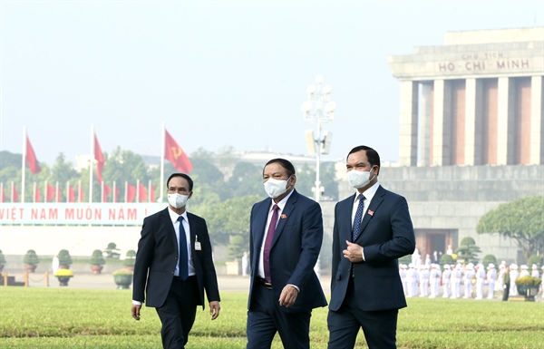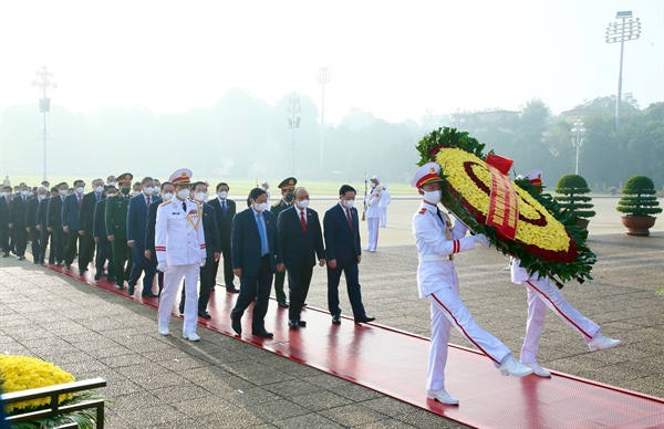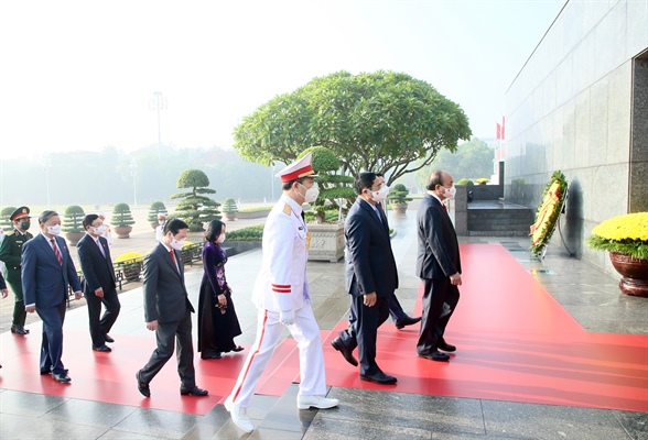 Chủ tịch nước Nguyễn Xuân Phúc, Thủ tướng Phạm Minh Chính, Chủ tịch Quốc hội Vương Đình Huệ cùng các Đại biểu Quốc hội vào Lăng viếng Chủ tịch Hồ Chí Minh.