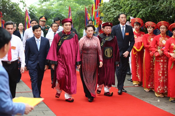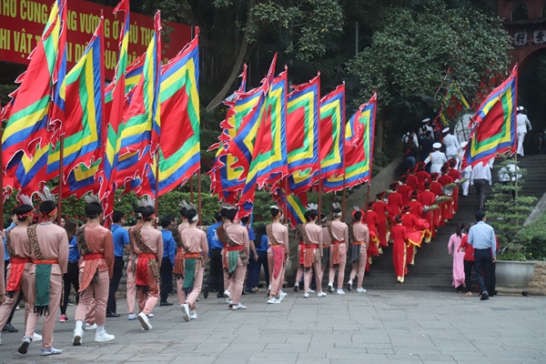 Chủ tịch Quốc hội Nguyễn Thị Kim Ngân; Bộ trưởng Nguyễn Ngọc Thiện; lãnh đạo tỉnh Phú Thọ và các đại biểu khởi hành từ sân trung tâm lên Đền Thượng để dâng hương tưởng nhớ các Vua Hùng