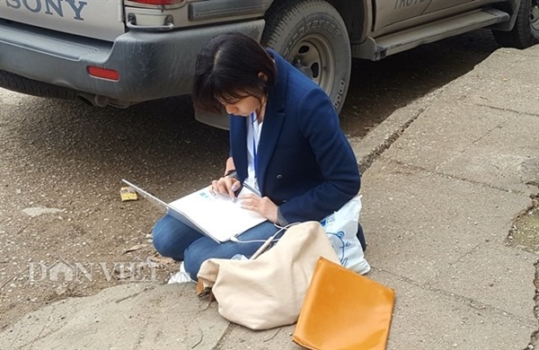 Nữ phóng viên nước ngoài ngồi vệ đường gấp rút cập nhật tin tức.