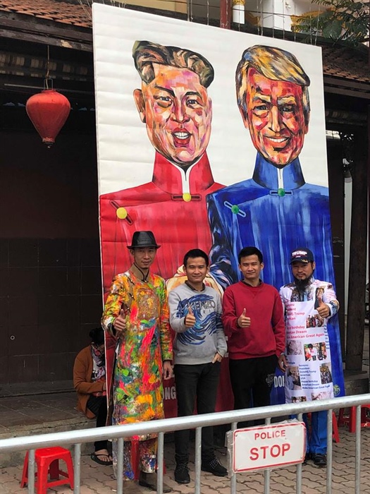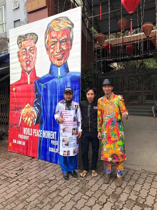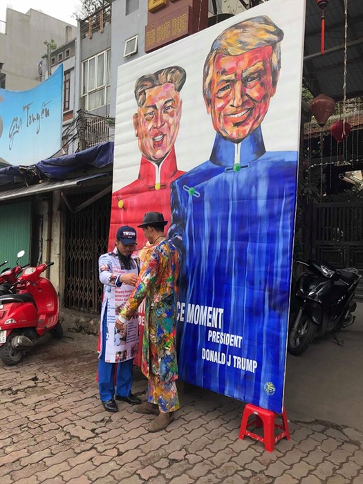 Đặc biệt, trong số đó, họa sĩ Trần Lâm Bình, tác giả đã thu hút sự chú ý của dư luận, truyền thông trong nước và quốc tế những ngày qua với bộ tranh chân dung Tổng thống Mỹ Donald Trump và Chủ tịch Triều Tiên Kim Jong-Un cùng cộng sự của mình là doanh nhân Hùng Cửu Long đã đưa tới gần khách sạn một bức tranh cỡ lớn vẽ Tổng thống Mỹ Donald Trump tươi cười bắt tay Chủ tịch Triều Tiên Kim Jong- Un trong trang phục áo dài truyền thống của Việt Nam.