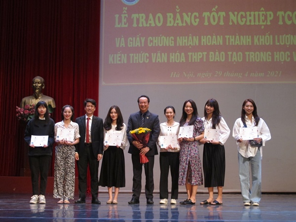 VHO-Thực hiện Công văn số 1261BGDĐT-GDTrH ngày 1.4.2021 của Bộ GD&ĐT; Thông báo số 76/TB-VPCP ngày 8.4.2021 của Văn phòng Chính phủ và Quyết định số 1303/QĐ-BVHTTDL ngày 9.4.2021 của Bộ VHTTDL về việc tổ chức triển khai thực hiện cấp bằng tốt nghiệp THCS, Trung cấp chuyên nghiệp và Giấy chứng nhận hoàn thành khối lượng kiến thức văn hóa THPT cho học sinh, sinh viên Học viện Múa Việt Nam, sáng nay (ngày 29.4), Học viện Múa Việt Nam đã  tổ chức Lễ cấp Bằng Tốt nghiệp Trung cấp chuyên nghiệp và Giấy chứng nhận hoàn thành khối lượng kiến thức văn hóa THPT cho học viên các khóa học trình độ Trung cấp, Cao đẳng giai đoạn năm 2012 - 2016