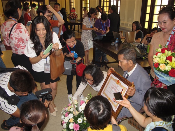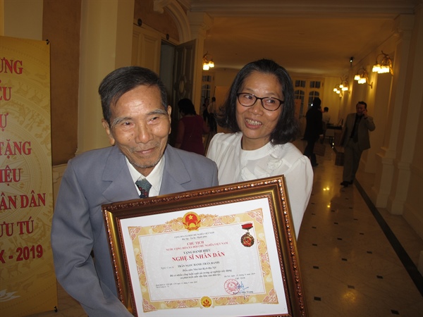 Phải vất vả lắm, cánh nhà báo mới len được đến gần NSND Trần Hạnh, ông là một trong những nghệ sĩ cao tuổi được phong tặng đợt này. Liên tục nở nụ cười rạng rỡ trên môi, NSND Trần Hạnh cho biết ông đã bước sang tuổi 90, sức khỏe đã giảm sút rất nhiều. Mắt bên phải của ông bị hỏng hoàn toàn, mắt bên trái cũng chỉ nhìn được lờ mờ... Vì vậy, ông phải nhờ cậy đến con gái dìu tới lễ trao tặng. Với ông, đó là sự ghi nhận đáng trân trọng của Đảng, Nhà nước đối với những nỗ lực của ông trong nghề nghiệp. “Tôi hạnh phúc vì được Đảng, Nhà nước trao tặng danh hiệu NSND. Còn gì hạnh phúc hơn khi những vai diễn, những đóng góp của mình được ghi nhận?”, NSND Trần Hạnh chia sẻ cảm xúc của mình khi đôi tay run run nâng niu Quyết định phong tặng danh hiệu NSND của Chủ tịch nước. Có những nhà báo và đồng nghiệp của ông đã lì xì chúc mừng ông ngay tại lễ phong tặng để mong ông thật khỏe, thật vui. Chia sẻ riêng với Báo Văn Hóa, đã lâu rồi ông không tham gia đóng vai diễn nào nhưng nếu có thể ông cũng sẵn sàng nếu được mời để vào những vai diễn nho nhỏ, có thời lượng ngắn phù hợp cho sức khỏe của mình.