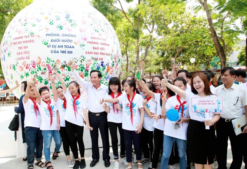 Bộ trưởng Đào Ngọc Dung và các đại biểu in bàn tay cam kết chung tay vì sự an toàn vho trẻ em