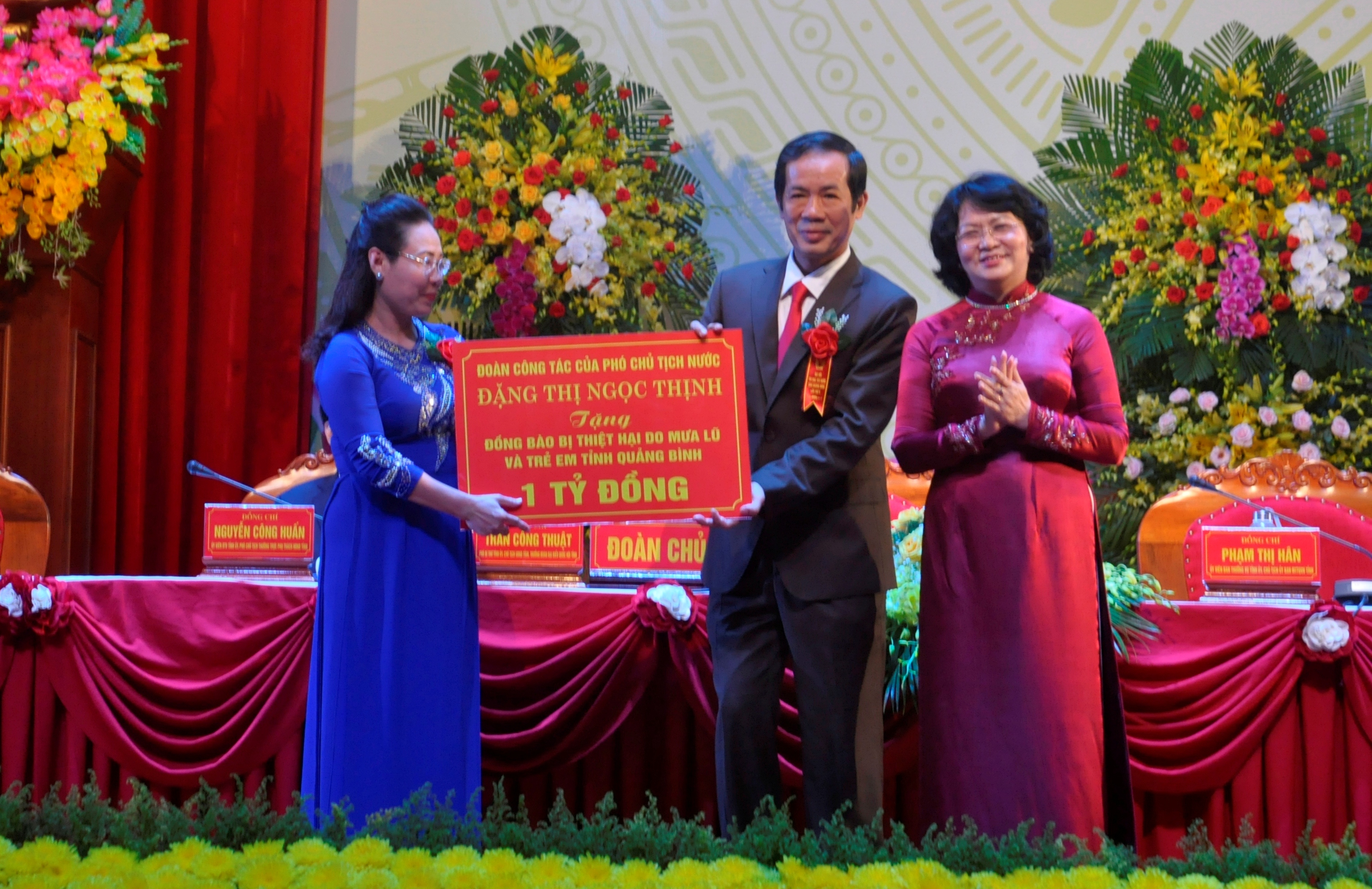 Tại Đại hội, Phó Chủ tịch nước Đặng Thị Ngọc Thịnh đã gửi lời thăm hỏi, chia sẻ tới nhân dân vùng lũ Quảng Bình bị ảnh hưởng trong đợt mưa lũ vừa qua; đồng thời, trao tặng nhân dân vùng lũ Quảng Bình và trẻ em có hoàn cảnh khó khăn trên địa bàn tỉnh Quảng Bình tổng số tiền 1 tỉ đồng.