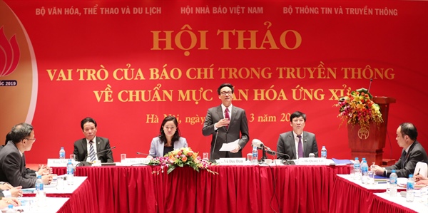 Đề cập đến phát huy vai trò báo chí trong tuyên truyền về chuẩn mực văn hóa ứng xử, theo Phó Thủ tướng, nếu truyền thông tập trung đẩy mạnh nhằm tạo chuyển biến, đẩy lùi những thói quen không tốt, tạo sức lan tỏa từ những giá trị đẹp đẽ… thì xã hội sẽ tốt hơn rất nhiều. “Báo chí phải tạo nên chuyển biến hành vi trong xã hội để xây dựng nếp sống văn hóa, phát huy vai trò định hướng dư luận, nêu gương tốt và phê phán cái xấu. Khi đưa tin, cần phân tích các hành vi xét trên góc độ văn hóa và đưa ra những khuyến nghị, định hướng. Việc này không chỉ cần các nhà báo nghiên cứu về văn hóa mà còn cần các nhà nghiên cứu văn hóa làm cộng tác viên, đồng thời là những người cùng với nhà báo viết nên những tác phẩm báo chí đi vào lòng người…”, Phó Thủ tướng chỉ đạo.