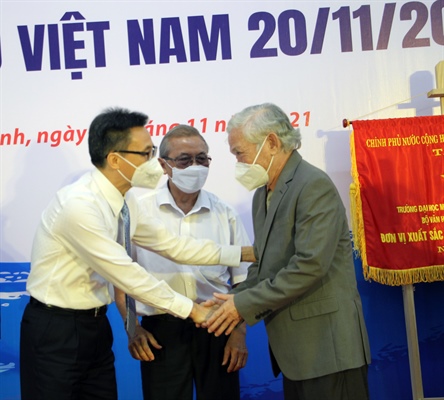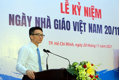 Phó Thủ tướng Vũ Đức Đam đã gửi lời chúc mừng, tri ân đến các thế hệ nhà giáo, người làm công tác giáo dục trên cả nước, trong suốt 2 năm qua đã vượt qua rất nhiều khó khăn, tận tụy với nghề, đào tạo nên các thế hệ sinh viên. Phó Thủ tướng cho biết trong những ngày trực tiếp chỉ đạo công tác chống dịch tại TP.HCM và các tỉnh phía Nam, ông đã gặp nhiều thầy cô giáo tham gia hỗ trợ công tác phòng dịch, xét nghiệm, lo an sinh xã hội cho người gặp khó khăn, chăm sóc cho các bệnh nhân Covid-19... Có những người đã bị nhiễm bệnh, đã mất. “Sau gần 2 tháng dịch bệnh được kiểm soát, TP.HCM đã dần có sức sống trở lại. Trong gian khó, chúng ta vẫn phải đứng lên mạnh mẽ”, Phó Thủ tướng chia sẻ. Theo Phó Thủ tướng, những người đóng góp vào sự nghiệp trồng người đều mang trên mình sứ mệnh đặc biệt, luôn luôn đòi hỏi sự tâm huyết, trí tuệ và cả sức lao động rất gian khổ, nhất là những thầy cô giáo ở vùng sâu, vùng xa, biên giới, hải đảo hay những thầy cô giáo dành thời gian, tâm sức cho các em học sinh có hoàn cảnh đặc biệt.