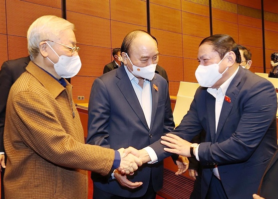 Tổng Bí thư Nguyễn Phú Trọng, Chủ tịch nước Nguyễn Xuân Phúc với Bộ trưởng Bộ VHTTDL Nguyễn Văn Hùng tại kỳ họp thứ 2, Quốc hội khoá XV. Ảnh: TTXVN