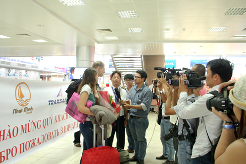 Phóng viên các cơ quan báo chí phỏng vấn du khách nước ngoài tại Cảng hàng không quốc tế Cam Ranh, Khánh Hòa