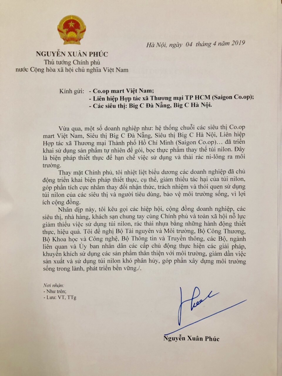 Trong thư, Thủ tướng nêu rõ vừa qua, một số doanh nghiệp như: hệ thống chuỗi các siêu thị Co.op mart Việt Nam, siêu thị Big C Đà Nẵng, siêu thị Big C Hà Nội, Liên hiệp Hợp tác xã Thương mại Thành phố Hồ Chí Minh (Saigon Co.op)... đã triển khai sử dụng sản phẩm tự nhiên để gói, bọc thực phẩm thay thế túi nilon. Đây là biện pháp thiết thực để hạn chế việc sử dụng và thải rác nilon ra môi trường.