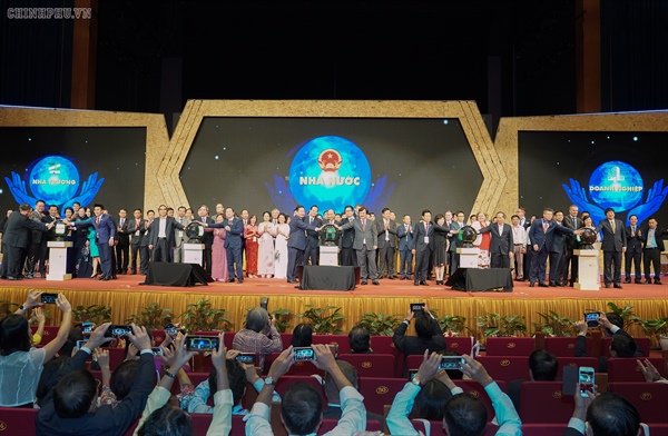 Thủ tướng cùng các đại biểu thực hiện nghi thức “Nhà nước, doanh nghiệp, nhà trường đồng hành đổi mới, nâng cao chất ượng giáo dục nghề nghiệp, nâng tầm kỹ năng lao động Việt Nam”