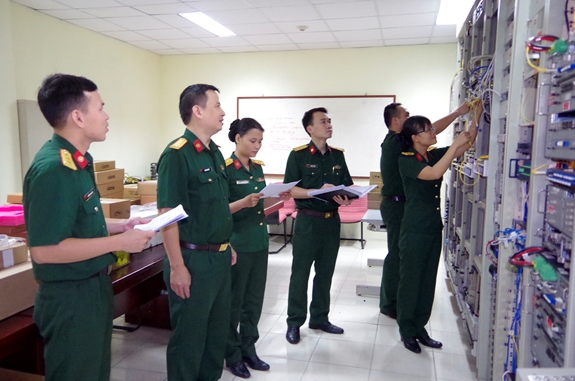 Đại tá Hồ Xuân Hổ- Giám đốc Trung tâm CNC- tập thể điển hình tiên tiến toàn quân kiểm tra phòng Lab thông tin vệ tinh của đơn vị.