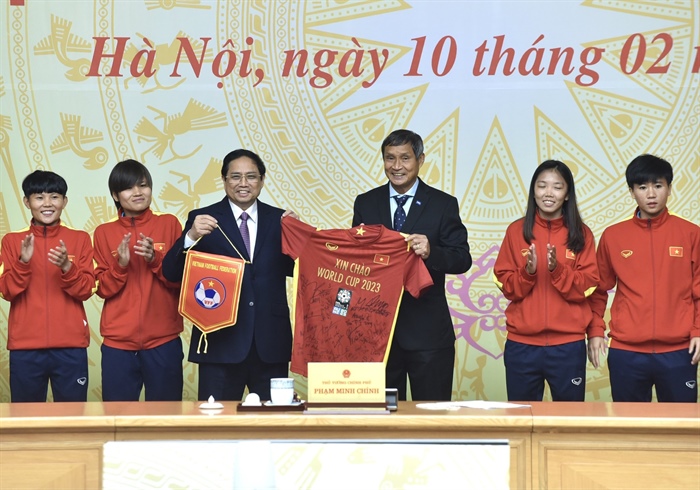 “Mọi người vẫn gọi các cầu thủ bóng đã nữ là “những cô gái vàng của thể thao Việt Nam” khi đã đạt được nhiều thành tích nổi bật trên đấu trường quốc tế trong thời gian vừa qua. Nhưng đó là những thành tích ở tầm khu vực. Với những thành tích, sự cố gắng, nỗ lực vượt bậc để lần đầu tiên trong lịch sử đội tuyển bóng đá nữ quốc gia của chúng ta giành được quyền tham dự World Cup 2023, tôi muốn gọi là những “cô gái kim cương” và “huấn luyện viên kim cương” của thể thao Việt Nam đã thể hiện tài năng, trí tuệ, phẩm chất, ý chí, bản lĩnh của người Việt Nam. Những ngày đầu xuân này, chiến thắng của đội tuyển bóng đá nam và nữ được ví như món quà lì xì may mắn đầu năm mới, lan tỏa năng lượng tích cực đến người hâm mộ cả nước”, Thủ tướng nhấn mạnh.