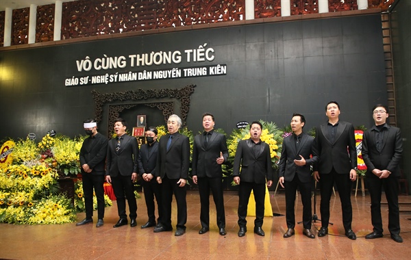 Ngày hôm nay, tiễn đưa ông về nơi an nghỉ cuối cùng, hiện diện bao nhiêu bạn bè, bao nhiêu thế hệ học trò mà ông đã giảng dạy… Họ sẽ luôn ghi nhớ về những thành tựu của ông trên con đường nghệ thuật. Tất cả chúng ta nhớ về ông như một nghệ sĩ yêu nước, cả cuộc sống đã làm việc và cống hiến. Chúng ta nhớ về một người thầy tận tụy, một trí thức giàu lòng tự trọng, một nhà lãnh đạo chính trực, có tâm và có tầm, một người bạn hiền và đôn hậu. Chúng ta sẽ giữ mãi hình ảnh về người chồng, người cha, người thầy, người anh, người bạn, người đồng nghiệp đáng kính”, Thứ trưởng Hoàng Đạo Cương đọc lời tiễn biệt GS.NSND Trung Kiên.