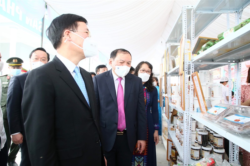 Thường trực Ban Bí thư Võ Văn Thưởng, Bộ trưởng Nguyễn Văn Hùng và các đại biểu xem sản phẩm OCOP tại thôn 6, xã Nam Giang
