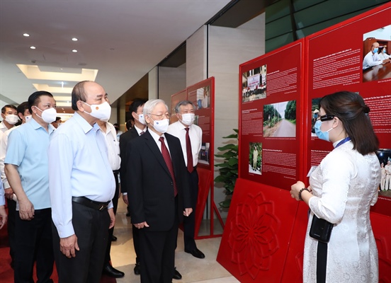 Tổng Bí thư Nguyễn Phú Trọng, Chủ tịch nước Nguyễn Xuân Phúc và các đại biểu tham quan, nghe giới thiệu Triển lãm “Những tấm gương bình dị mà cao quý”