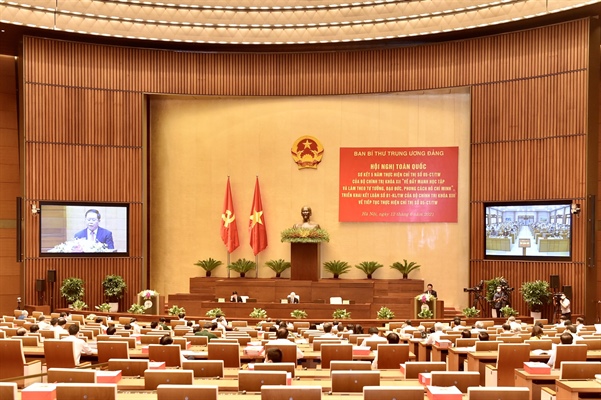 VHO-Sáng 12.6, Ban Bí thư Trung ương Đảng tổ chức Hội nghị trực tuyến toàn quốc sơ kết 5 năm thực hiện Chỉ thị số 05-CT/TW của Bộ Chính trị khóa XII “Về đẩy mạnh học tập và làm theo tư tưởng, đạo đức, phong cách Hồ Chí Minh”, triển khai Kết luận số 01-KL/TW của Bộ Chính trị khóa XIII về tiếp tục thực hiện Chỉ thị số 05-CT/TW. Tổng Bí thư Nguyễn Phú Trọng chủ trì Hội nghị.