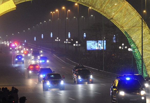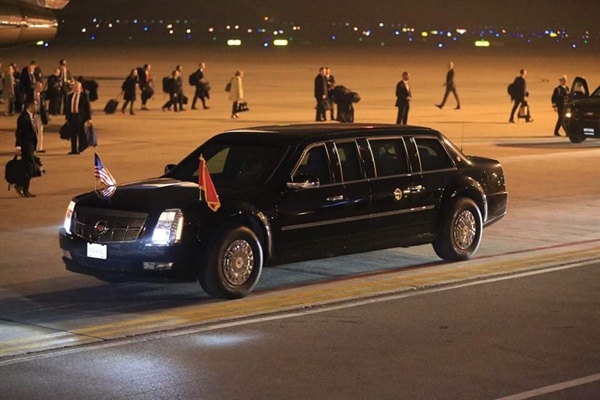 Sau nghi lễ đón ở sân bay Nội Bài, Tổng thống Trump lên "quái thú" về khách sạn Marriott.