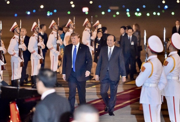 Bộ trưởng, Chủ nhiệm Văn phòng Chính phủ Mai Tiến Dũng, Thứ trưởng thường trực Bộ Ngoại giao Bùi Thanh Sơn, Chủ tịch UBND TP Hà Nội Nguyễn Đức Chung, Đại sứ Mỹ tại Việt Nam Daniel Kritenbrink cùng các quan chức hai nước đón Tổng thống Mỹ Donald Trump tại sân bay quốc tế Nội Bài
