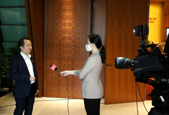 Đại biểu Bùi Hoài Sơn trao đổi với báo chí bên hàng lang Quốc hội