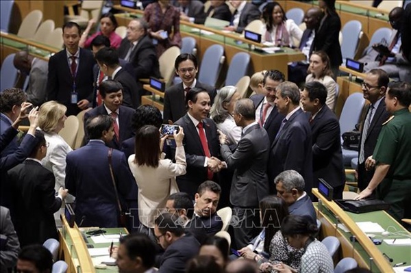 Trưởng đoàn Việt Nam, Thứ trưởng Bộ Ngoại giao Lê Hoài Trung (giữa trái) nhận lời chúc mừng của đại diện ngoại giao các nước sau khi kết quả bỏ phiếu cho thấy Việt Nam được bầu chọn là ủy viên không thường trực HĐBA LHQ nhiệm kỳ 2020-2021 tại New York, Mỹ ngày 7.6. Ảnh: TTXVN