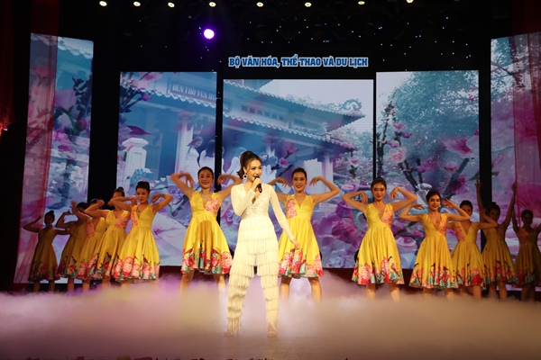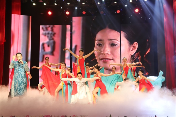 Vụ trưởng Vụ Văn hoá Văn nghệ Ban Tuyên giáo Trung ương Nguyễn Minh Nhật và Chủ tịch Liên hiệp các Hội VHNT Việt Nam, nhạc sĩ Đỗ Hồng Quân tặng hoa và cúp lưu niệm cho các nghệ sĩ