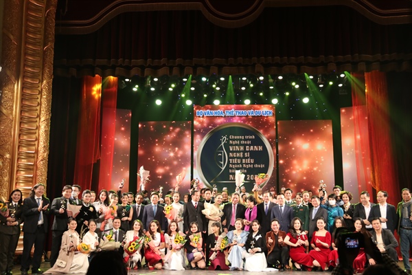 Bộ trưởng Nguyễn Văn Hùng và Phó Trưởng Ban Dân vận Trung ương Nguyễn Lam tặng hoa và Cúp lưu niệm cho các nghệ sĩ được vinh danh