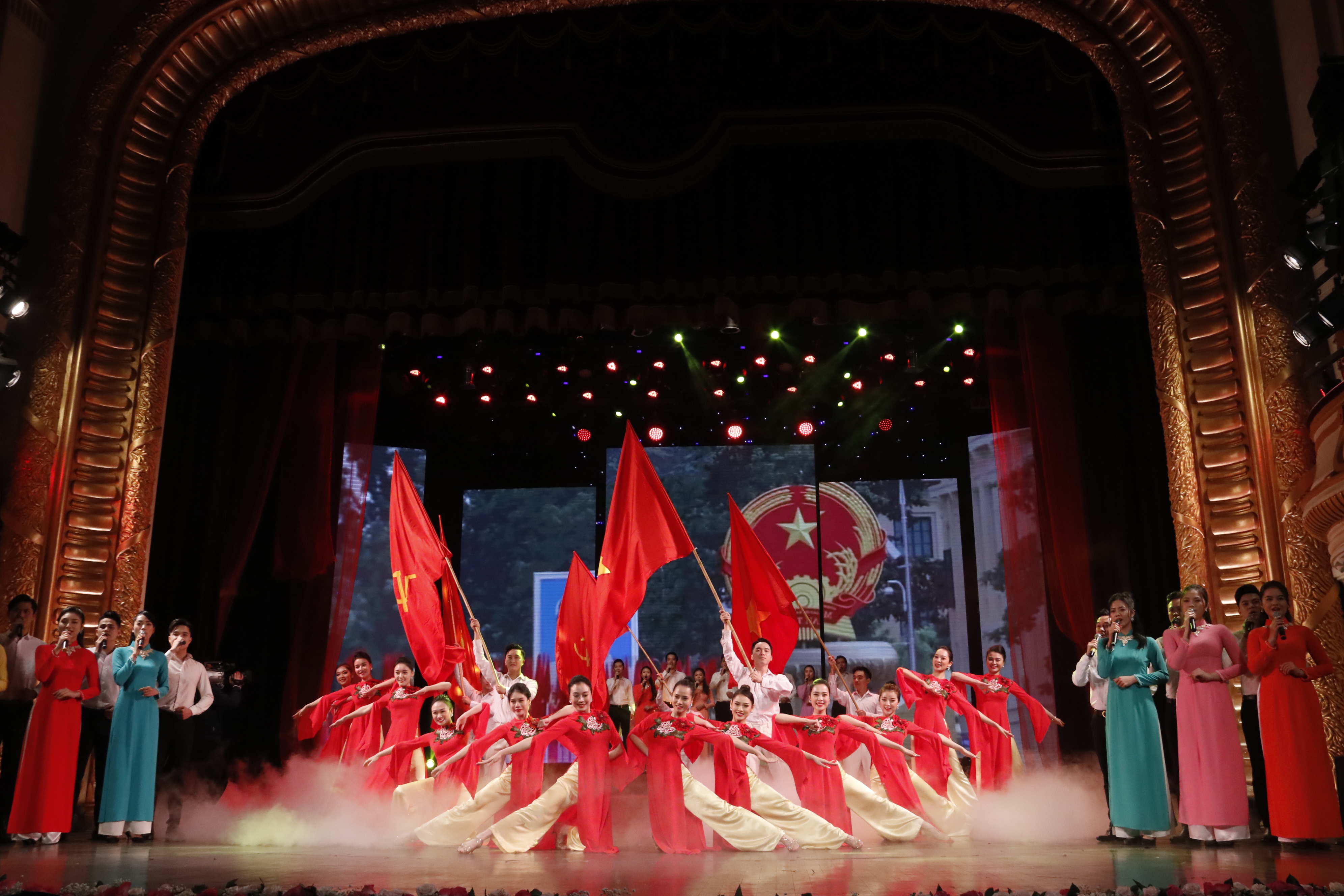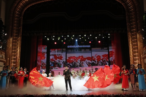 Vụ trưởng Vụ Văn hoá Văn nghệ Ban Tuyên giáo Trung ương Nguyễn Minh Nhật và Chủ tịch Liên hiệp các Hội VHNT Việt Nam, nhạc sĩ Đỗ Hồng Quân tặng hoa và cúp lưu niệm cho các nghệ sĩ