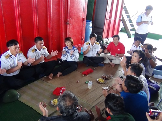 Còn diễn viên Thanh Loan, đến từ đội văn nghệ xung kích tỉnh Long An chia sẻ: “Cảm nhận của em hát giữa biển khơi rất khác biệt. Khi cầm tay các anh lính kiểm ngư đi vòng tròn quanh boong tàu, em chực khóc. Em chẳng thấy khoảng cách nào, chỉ thấy ấm áp đầy tình yêu thương”.