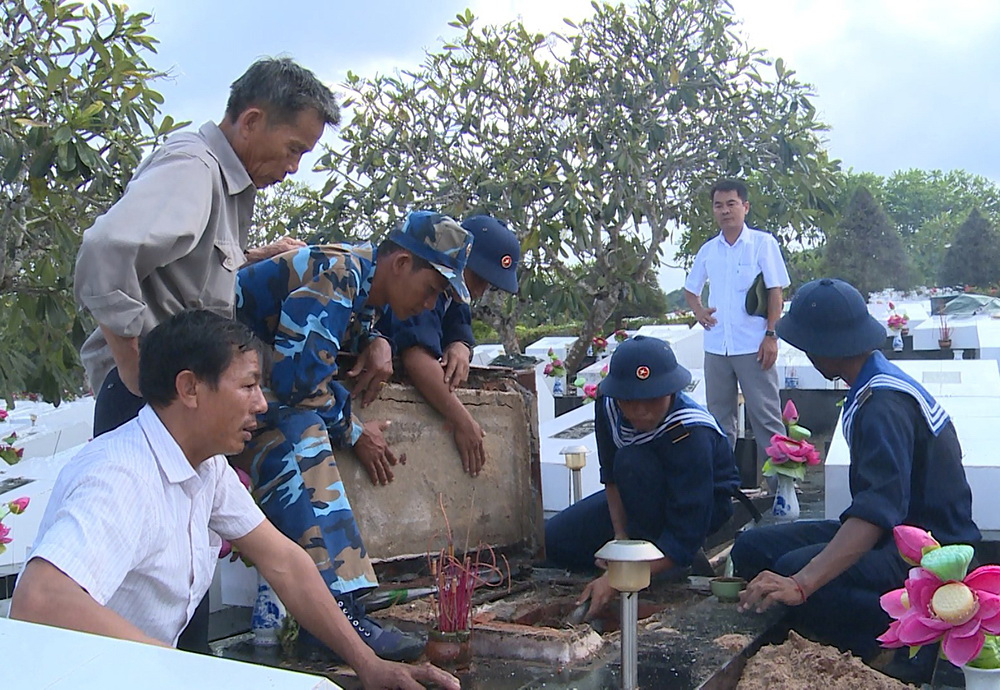 Các chiến sĩ Vùng 2 Hải quân cùng gia đình chuẩn bị đưa di cốt 17 liệt sĩ Hải quân từ nghĩa trang Hàng Dương Phú Quốc về đất mẹ