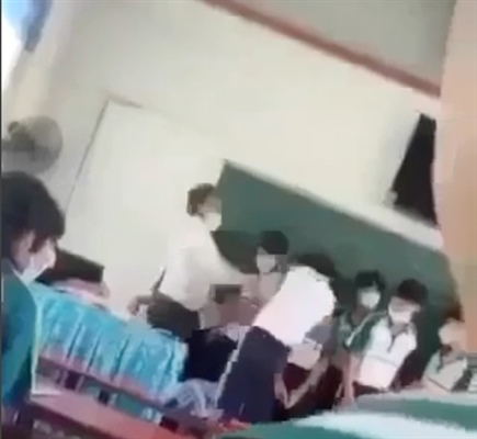 Thầy giáo H. tát học sinh. Ảnh cắt từ clip
