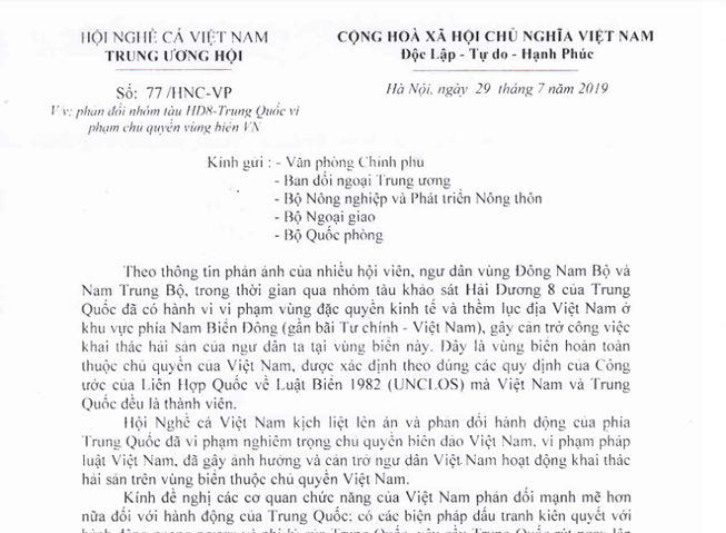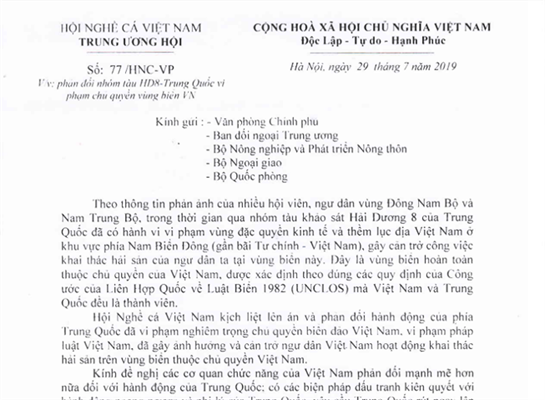Trung ương Hội Nghề cá Việt Nam kính đề nghị các cơ quan chức năng của Việt Nam phản đối mạnh mẽ hơn nữa đối với hành động của Trung Quốc; có các biện pháp đấu tranh kiên quyết với hành động ngang ngược và phi lý của Trung Quốc; yêu cầu Trung Quốc rút ngay lập tức nhóm tàu Hải Dương 8 ra khỏi vùng biển của Việt Nam.Hội Nghề cá Việt Nam kịch liệt lên án và phản đối hành động của phía Trung Quốc đã vi phạm nghiêm trọng chủ quyền biển đảo Việt Nam, vi phạm pháp luật Việt Nam, đã gây ảnh hưởng và cản trở ngư dân Việt Nam hoạt động khai thác hải sản trên vùng biển thuộc chủ quyền Việt Nam.
