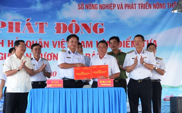 Tại lễ phát động, Bộ Tư lệnh vùng 5 Hải quân và Sở Nông nghiệp và Phát triển nông thôn tỉnh Kiên Giang ký kết kế hoạch phối hợp thực hiện chương trình “Hải quân Việt Nam làm điểm tựa cho ngư dân vươn khơi, bám biển” giai đoạn 2019-2020.