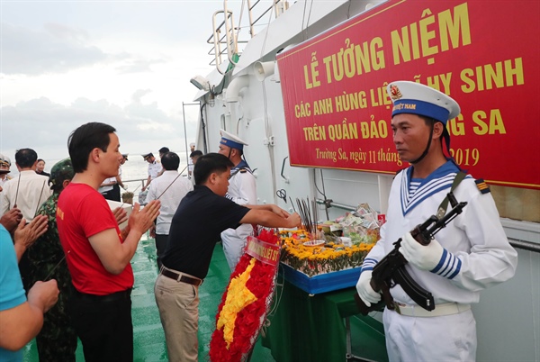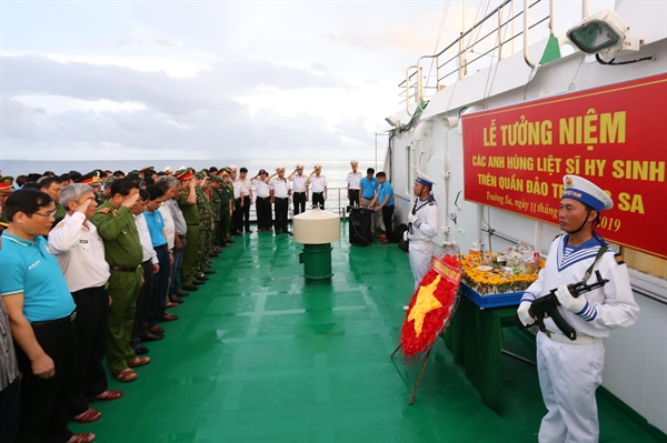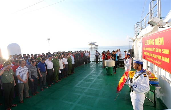 Cả 2 lễ tưởng niệm đều được tổ chức trên boong tàu Trường Sa 571. Giữa trùng khơi mênh mông, trong tiếng nhạc trầm hùng của bài “Hồn tử sĩ” từng nén nhang thơm của các đại biểu được thắp lên tưởng nhớ sự hy sinh. Nhiều đại biểu đã không nén nỗi xúc động đã đưa tay gạt nước mắt của mình.