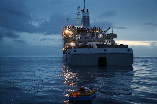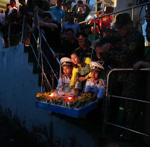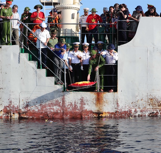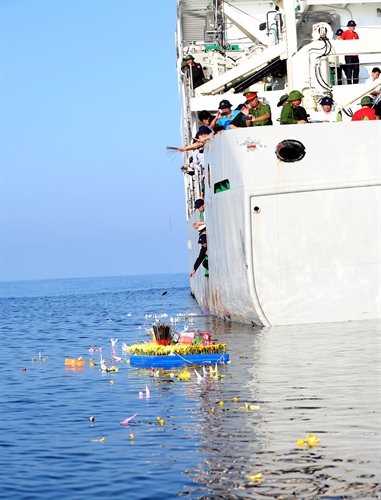Thả hoa và những con hạc giấy trắng xuống biển để bày tỏ lòng biết ơn trước sự hy sinh cao cả của những người con đất Việt đã không tiếc xương máu gìn giữ, bảo vệ chủ quyền quê hương và hy vọng đất nước, biển đảo quê hương luôn bình an