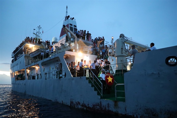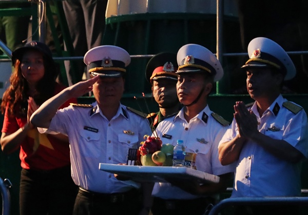 Các đại biểu trên tầu Trường Sa 571 súc động tưởng niệm tri ân các Anh hùng liệt sỹ đã hy sinh trên quần đảo Trường Sa của Việt Nam