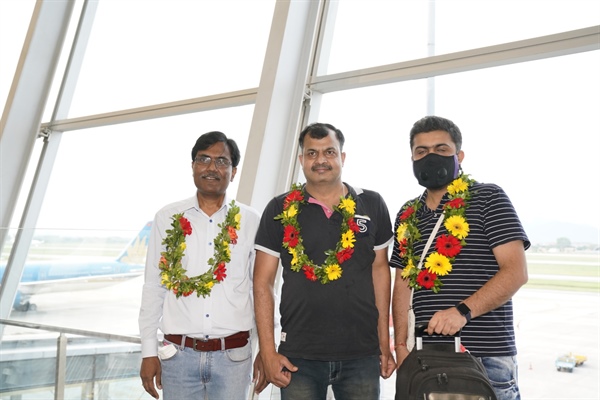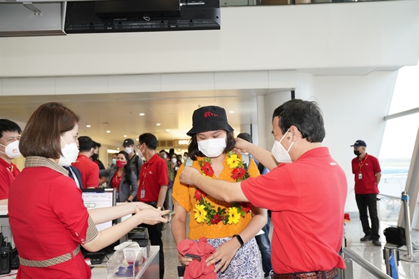 Chào đón những hành khách đầu tiên trở lại với đường bay tới Ấn Độ, lãnh đạo Cục Hàng không và Vietjet đã có mặt tại sân bay, tặng hoa và những lời chúc tốt đẹp trước hành trình.