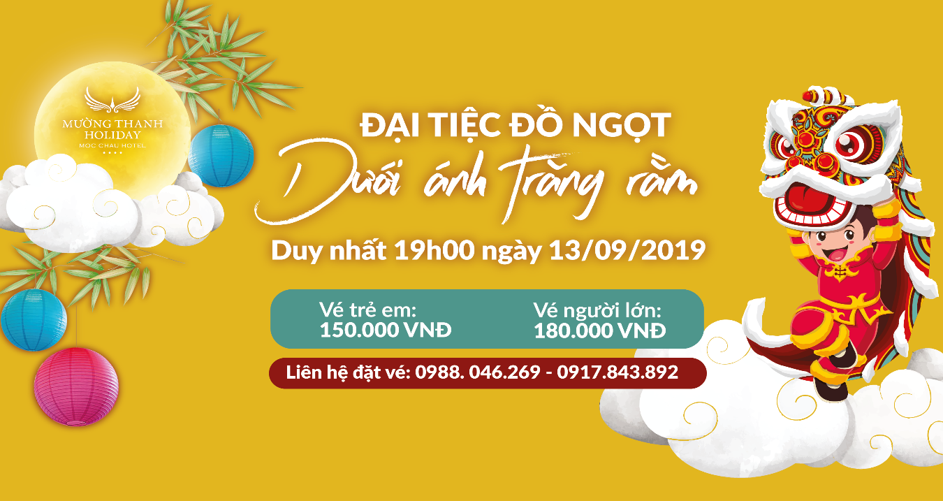 Mường Thanh Holiday Mộc Châu - ĐẠI TIỆC TRĂNG RẰM Cùng phá mâm cỗ siêu to khổng lồ với các loại bánh ngọt, chè, thạch, trái cây.. .và đồ uống đặc sắc Cùng thưởng thức màn múa lân, ảo thuật độc đáo, văn nghệ hấp dẫn, trò chơi vui nhộn. Duy nhất 19h00 ngày 13.9.2019 Vé trẻ em: 150,000 VND. Vé người lớn: 180,000 VND Liên hệ đặt vé: 0988. 046.269 - 0917.843.892 Mường Thanh Holiday Huế - DẠ TIỆC BUFFE TRĂNG RẰM Thưởng thức dạ tiệc buffet Trăng Rằm với hơn 30 món Á Âu đặc sắc. Thời gian: 18:00 đến 20:30 ngày 13.9.2019 Giá : 180,000 VND (miễn phí trẻ em dưới 1m) Địa điểm: Phòng tiệc An Hòa - tầng trệt Liên hệ đặt bàn: 0234 393 6688 hoặc 0989120887 |