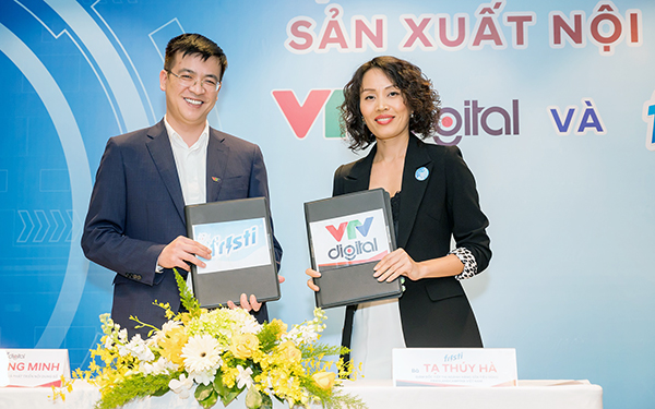 Nhà báo Lê Quang Minh, Giám đốc VTV Digital và Bà Tạ Thúy Hà, Giám đốc Tiếp thị Ngành hàng Sữa tiêu dùng FCV tiến hành ký kết hợp tác chiến lược giữa Fristi và VTV Digital